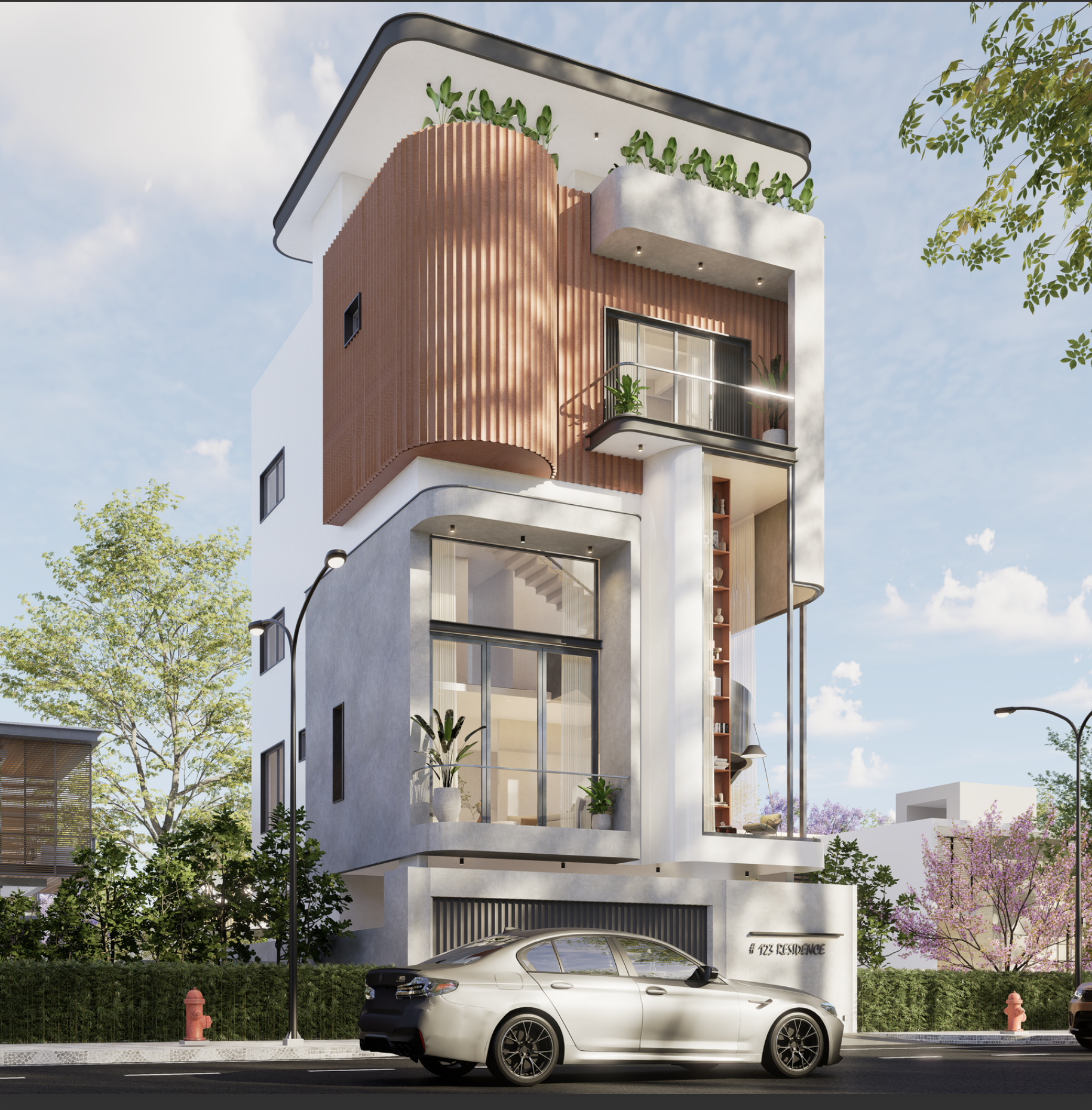 A completed multi-storey residence showcasing Auriga's precision in construction — copper-toned cladding, glass balcony railings, cantilevered volumes, and lush rooftop greenery. Built and delivered.